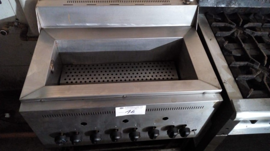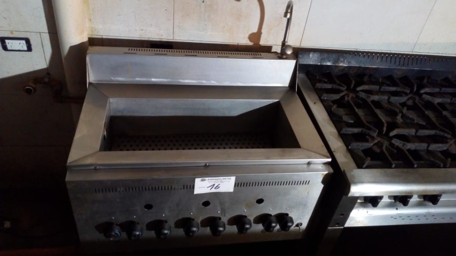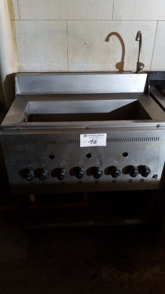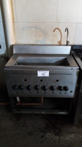 CUCCIPASTA DE ACERO INOXIDABLE DE 6 QUEMADORES, CON 8 PERILLAS, CON BASE ESTRUCTURAL. DE MEDIDAS 86CM×66CM×1MTS ALTO.