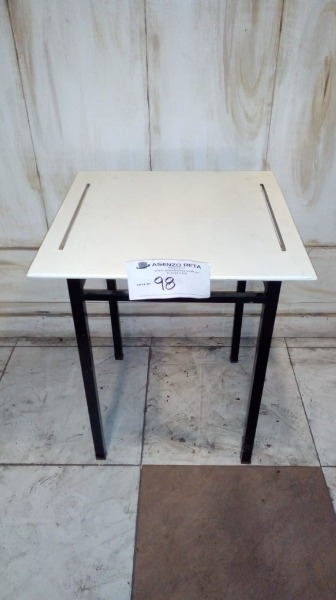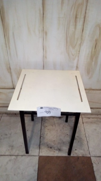MESA DE MADERA CON BASE ESTRUCTURAL DE HIERRO CON LÍNEAS EN LA MADERA, DE MEDIDAS 65CM×65CM×80CM