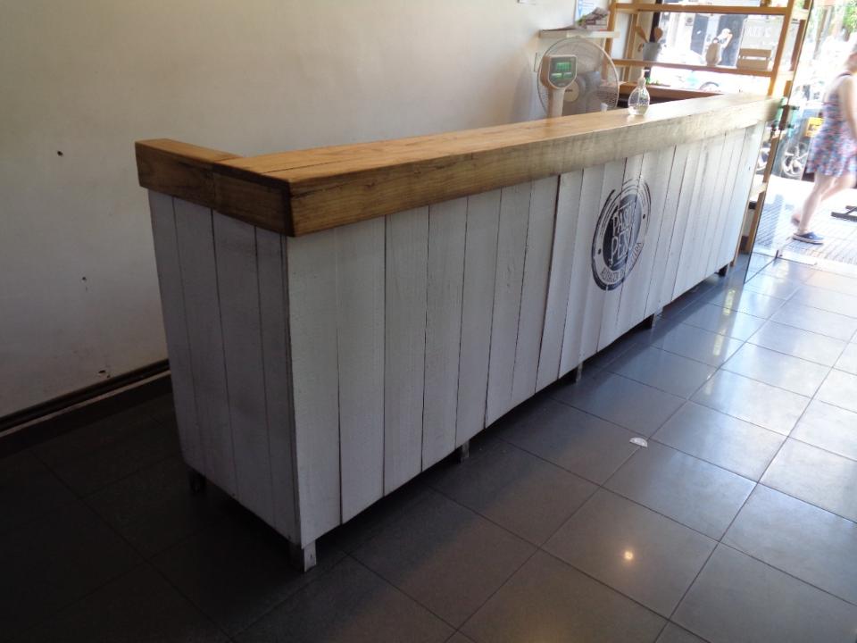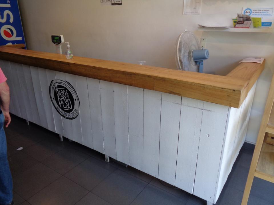 BARRA DE HIERRO EN L, CON TAPA Y FRENTE DE MADERA, MESADA DE MADERA DE 2.60 X 60 X 85 Y 2 ESTANTES INFERIORES MEDIDAS 3.75 MTS LINEAL, 1.30 MTS LA L,1.10 MTS DE ALTURA