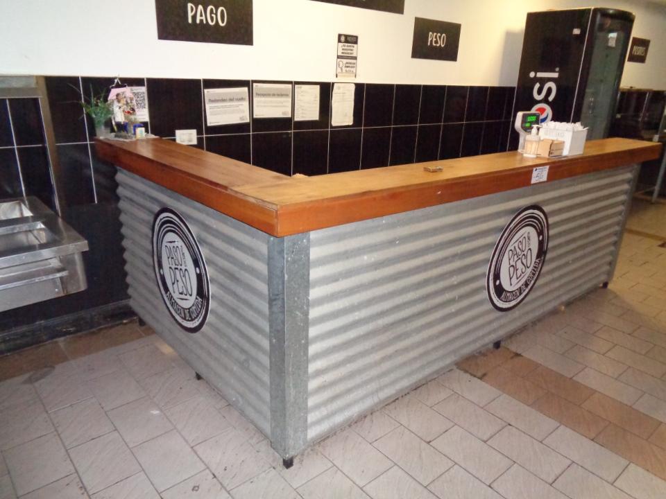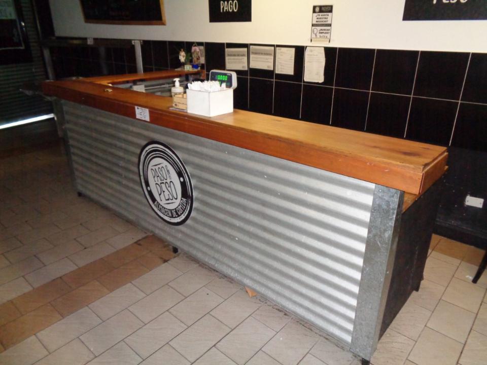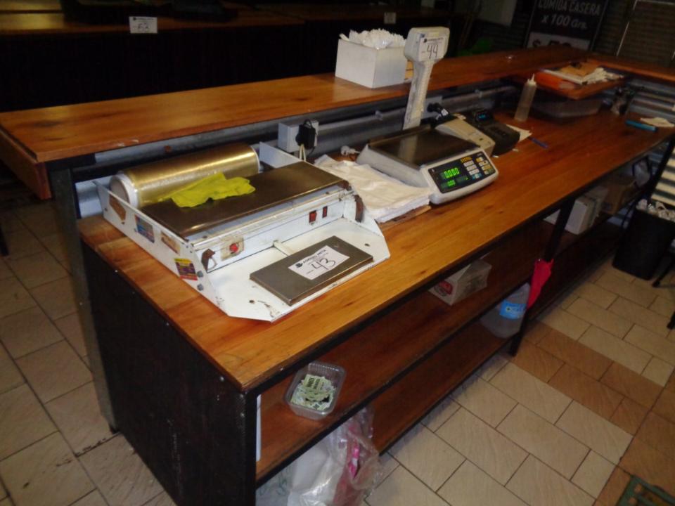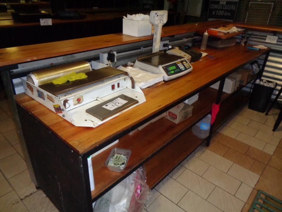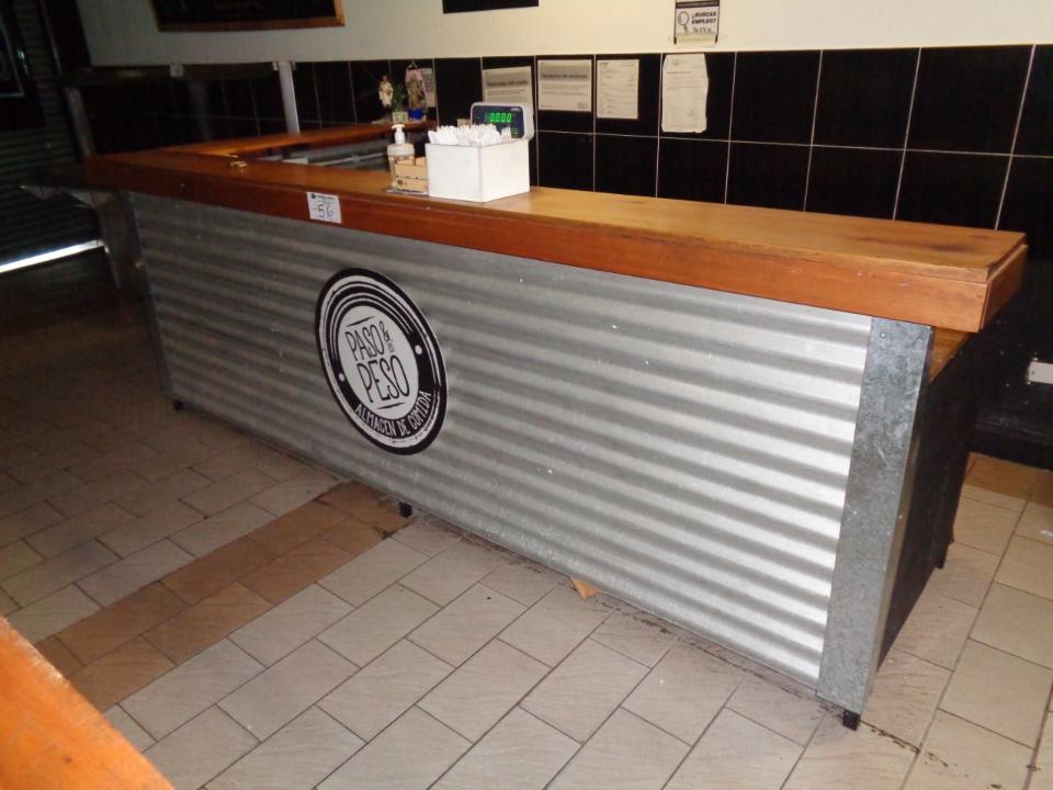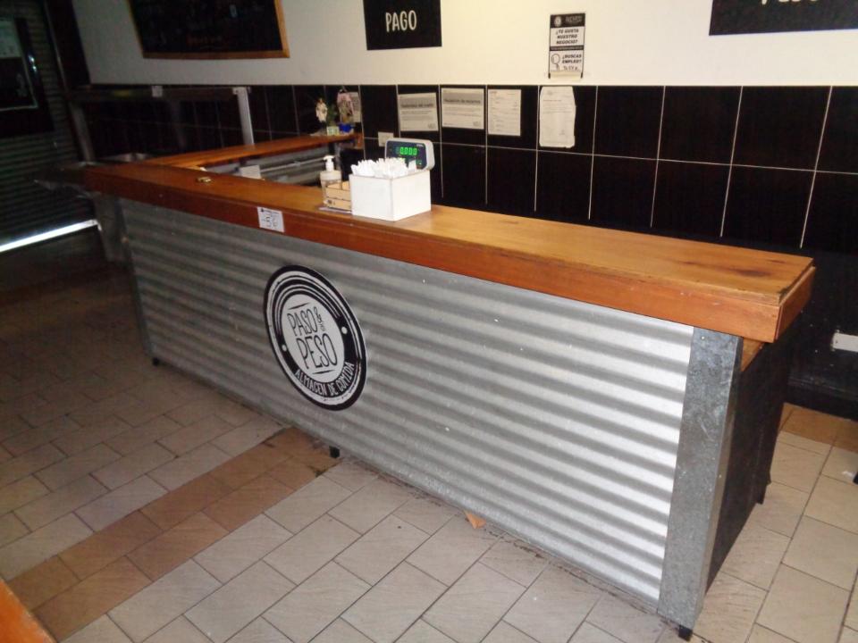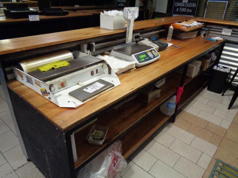 BARRA DE HIERRO EN L, TAPA Y FRENTE DE MADERA, CON MESADA DE 2 ESTANTES MEDIDAS 3.20 MTS LINEAL X 1.62 LA L X 1.10 MTS DE ALTURA ( MESADA MIDE 3.00 MTS X 75 CM X 84 CM ) (RETIRO POR AV TRUINVIRATO)